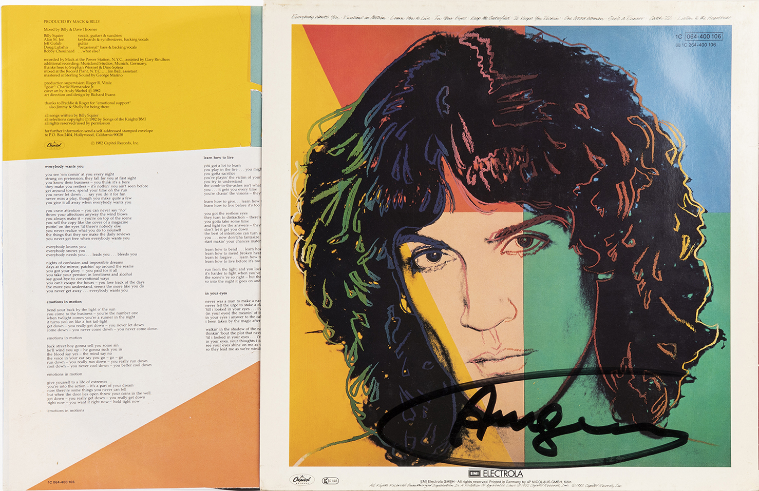 William Haislip "Billy" Squier, "Emotions in Motion", LP 33 giri, 1982, con copertina autografata a pennarello nero da Andy Warhol, su entrambe le facciate. 1C 064-400 106 A/B