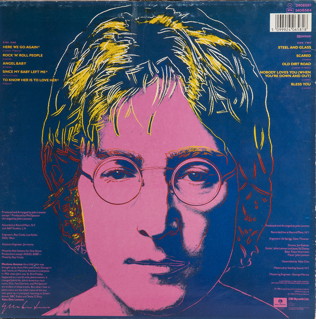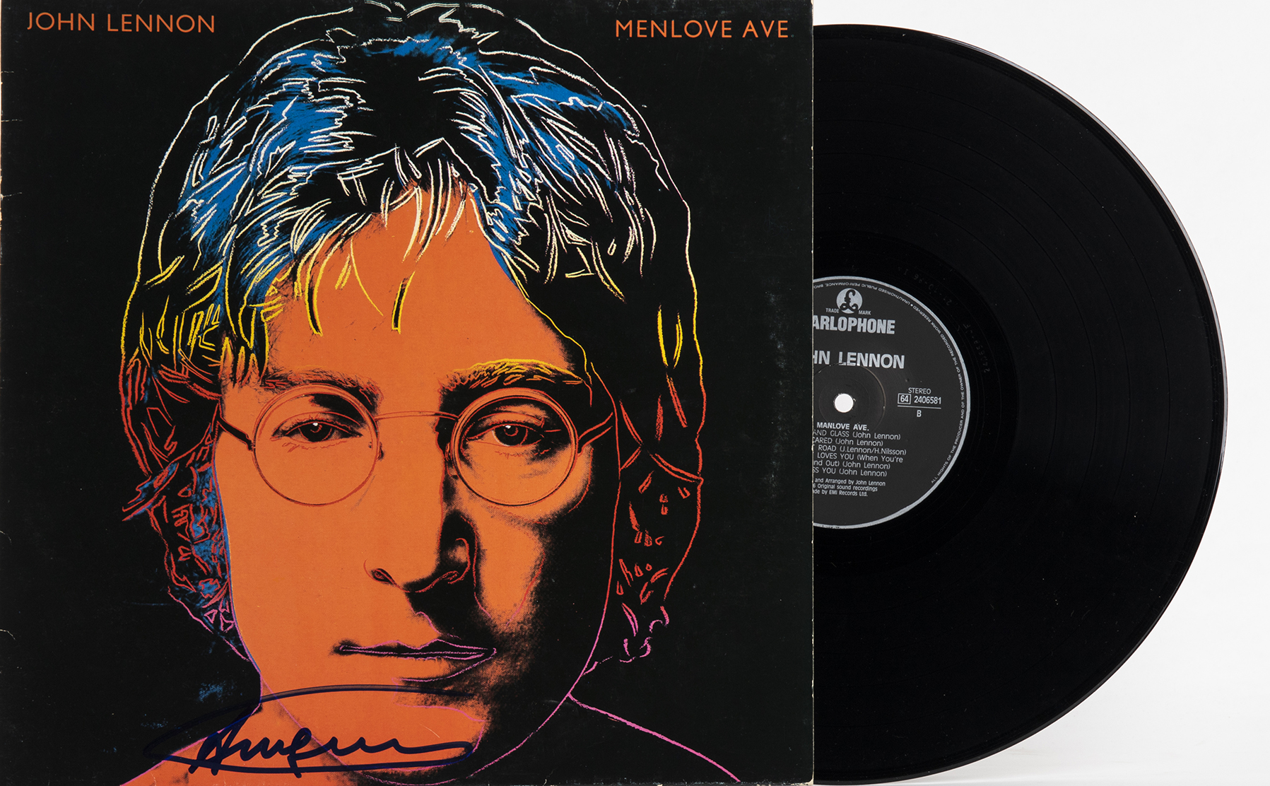 John Lennon, "Menlove Ave", LP 33 giri, 1986, con copertina autografata a pennarello nero da Andy Warhol. Il secondo album di Lennon pubblicato postumo, ad opera di Yoko Ono. Il ritratto di Lennon ad opera di Andy Warhol, realizzato pochi mesi prima che il cantante venisse ucciso. 2406581