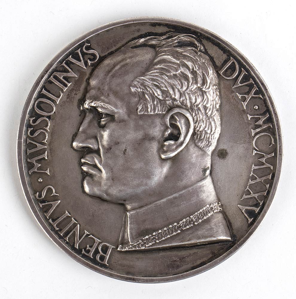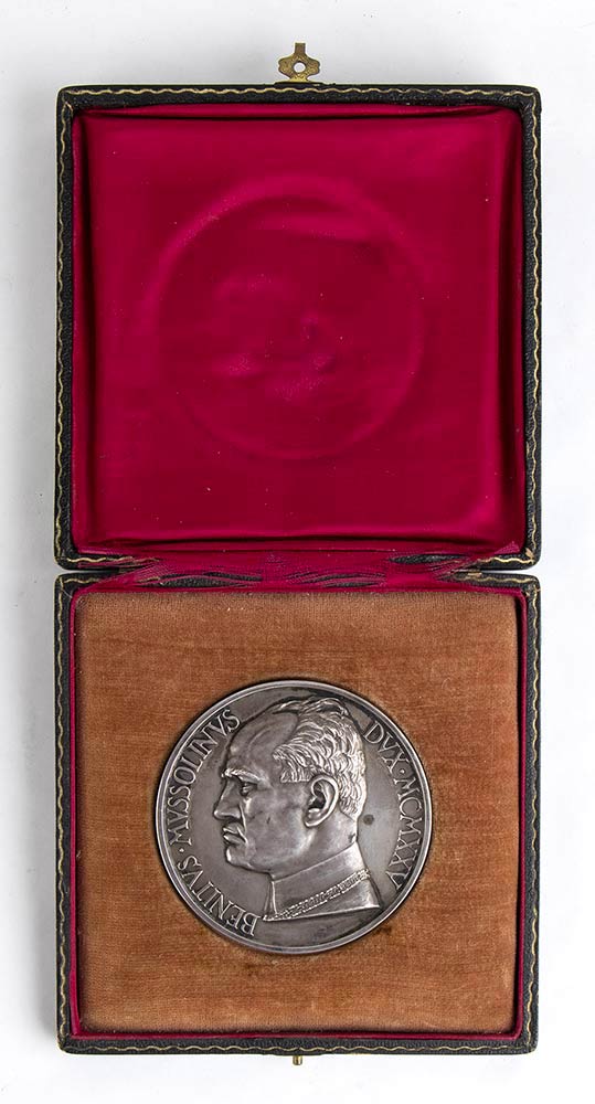 Medaglia in argento di grande formato commemorativa di Benilto Mussolini, 1925, firmata Mistruzzi,in astuccio, Regia Zecca.