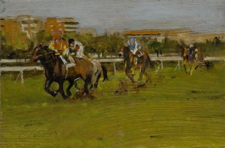 Piero Vaccari (Livorno, 1926 - 1997) Corse di cavalli Olio su tavola, cm. 20x30 Firma in basso a sinistra e sul verso.