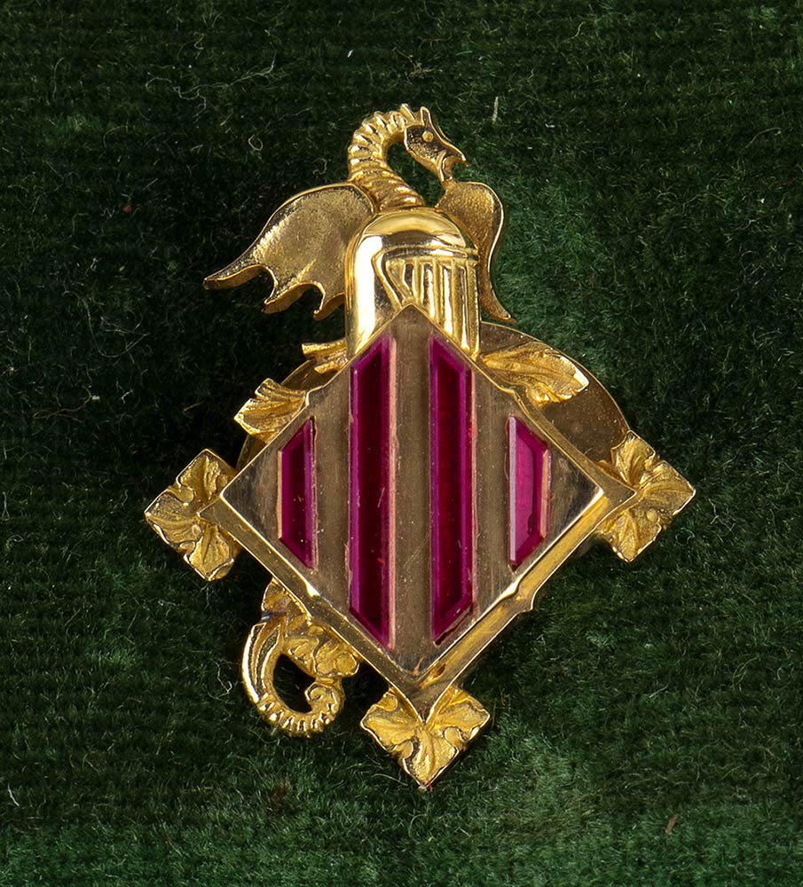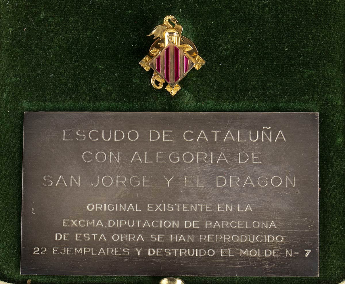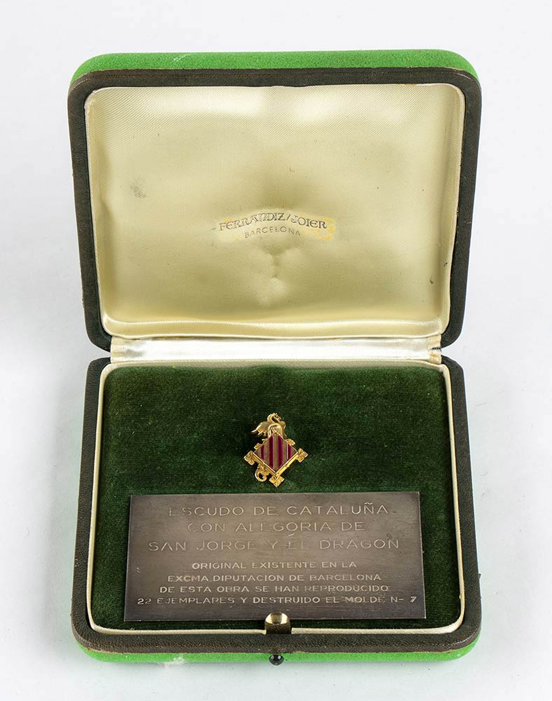 Distintivo in oro, scudetto araldico della Catalogna conallegoria di San Giorgio e il drago