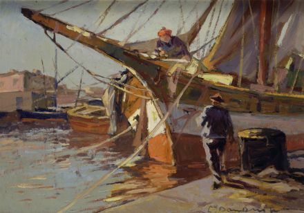 Carlo Domenici (Livorno, 1898 - 1981) Al porto Olio su faesite, cm. 35,5x50...