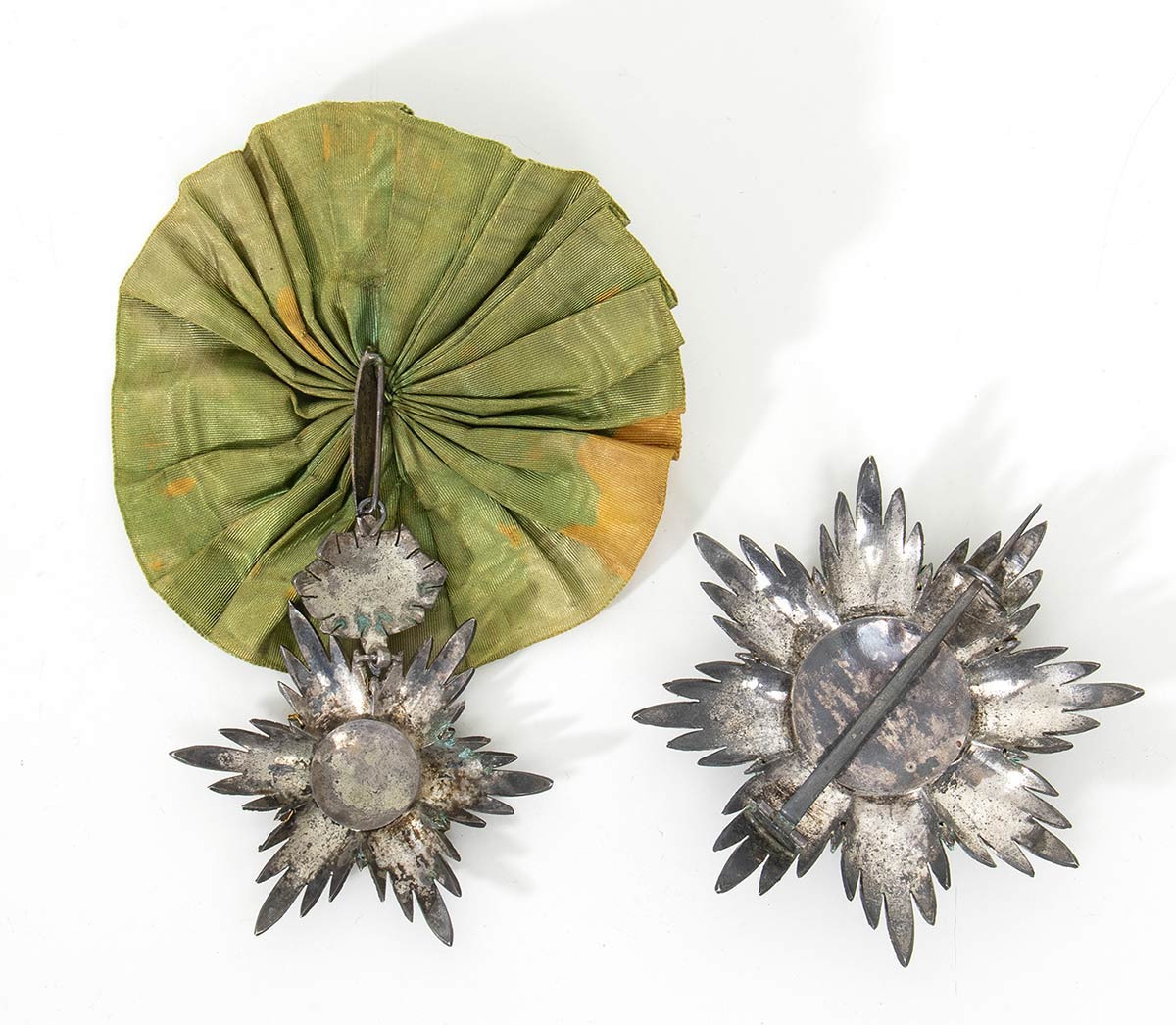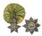 Bellissimo set di Gran Croce in argento gettato, cesellato e sfaccettato, grande placca ad otto punte traforata con al verso spillone centrale con doppio gancio di sospensione, pendente di eguale ottima fattura appeso alla coccarda di seta, bellissimi medaglioni centrali con miniatura in smalti policromi del sole che sorge alle spalle del leone, ottimo stato di conservazione, concessa all'artista Benedetto Civiletti, scultore del busto di Mozaffar al-Din Shah Qajar , all'epoca del ritratto principe ereditario.