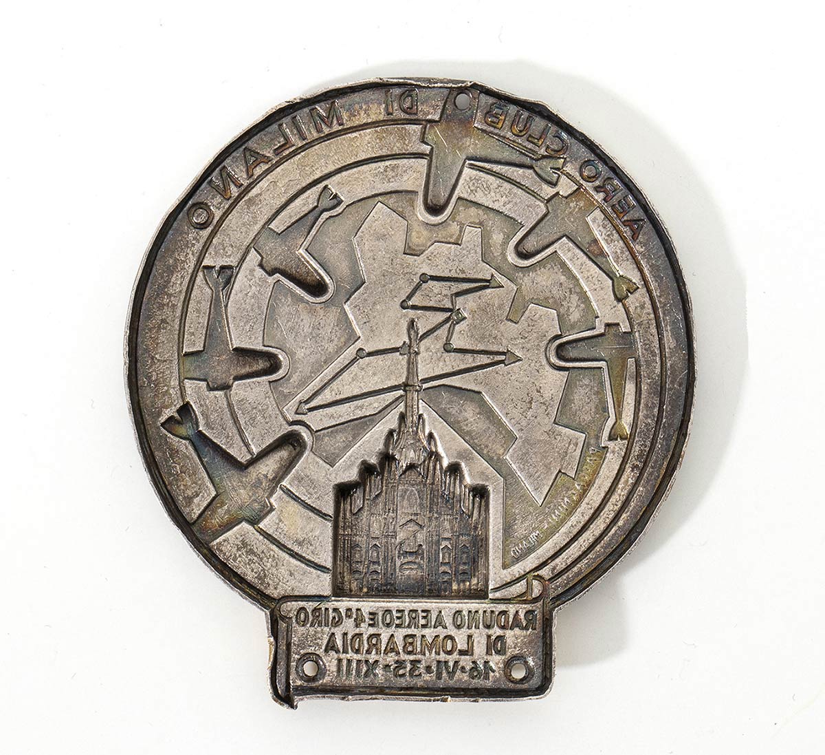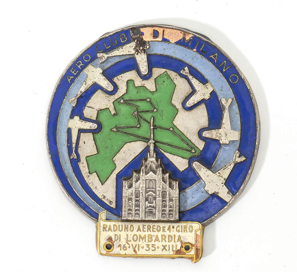 Smalti, 60x66 mm. Placchetta edita dall'aeroclub di Milano per il 4° giro aereo della Lombardia del 16-6-1935, di grafica futurista. difetti agli smalti