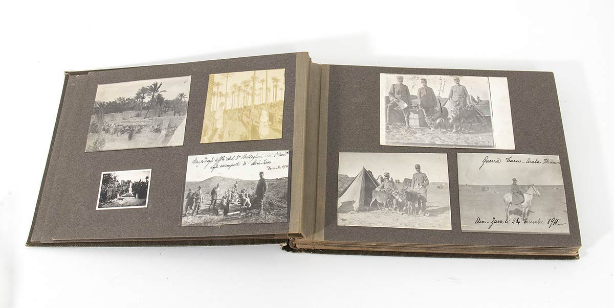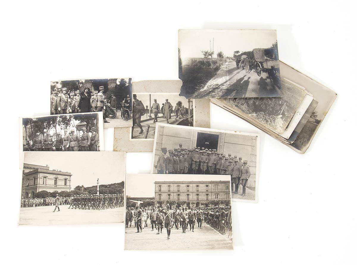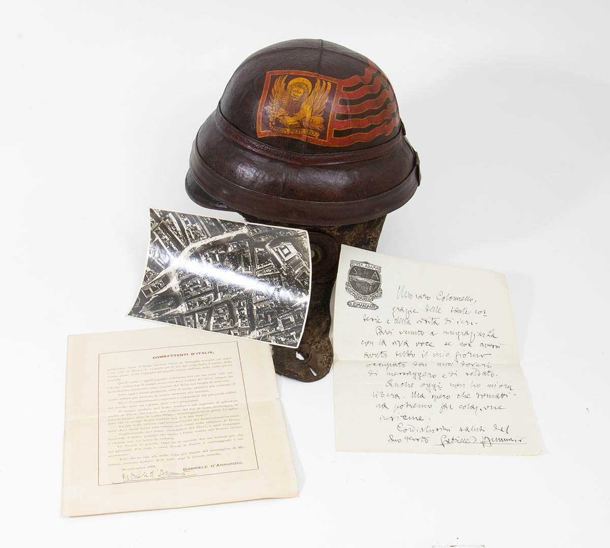 Eccezionale lotto comprendente casco da volo tipo Rold con dipinta magistralmente l'insegna della squadriglia "Serenissima", lettera autografa di G.D'Annunzio in cui ringrazia il colonnello Pericoli per la visita , foto aerea di Vienna con appunto del Vate (multiplo), fotografie di aerei durante ll conflitto sui campi di volo in Francia, foto varie ed astuccio dedicato al colonnello. ottimo stato, documento ed insieme di eccezionale valore storico