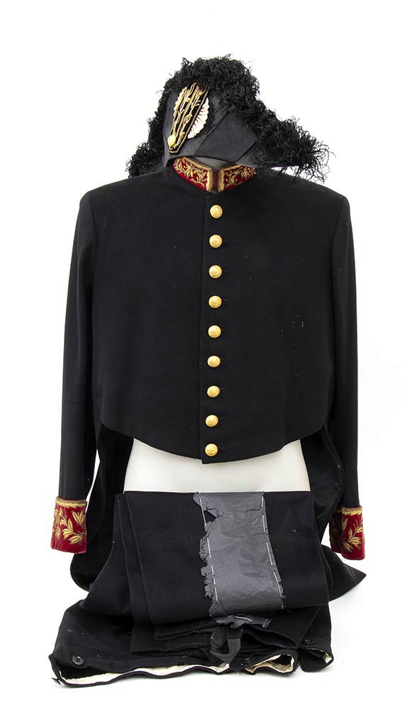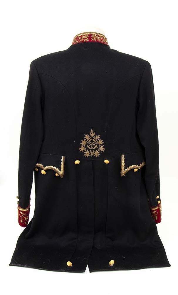 Uniforme da cameriere segreto di Sua Santità, giacca in fine castorino di lana con collo, paramani in velluto di seta amaranto con ricami in oro così come sulla parte posteriore della giacca, pantaloni con banda dorata ancora ricoperti della carta della sartoria per evitarne l'ossidazione, feluca con coccarda di seta bianco gialla e piumaggio. Ottimo stato