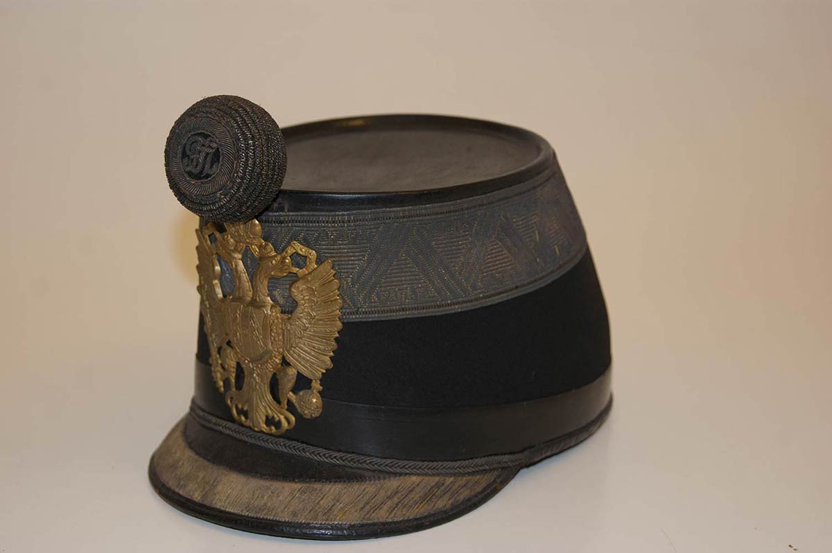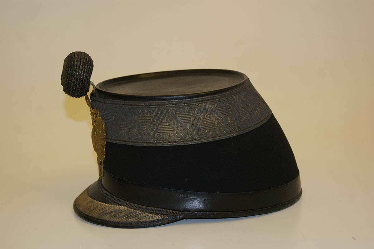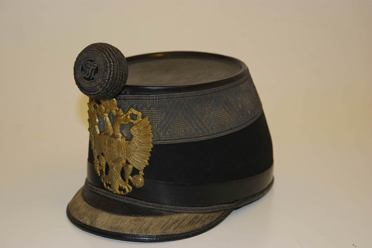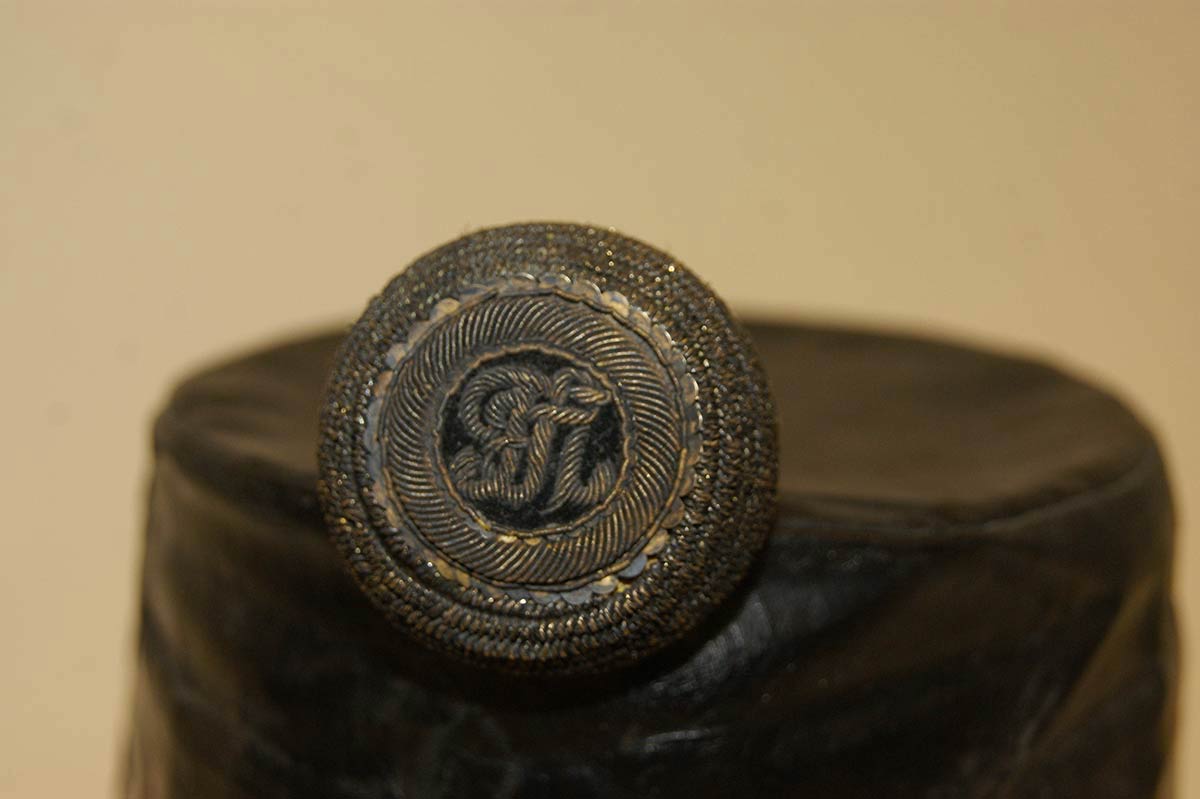 Fusto rigido ricoperto di panno nero con applicato gallone in tessuto operato oro, grande aqila bicipite in metallo dorato e nappina con le iniziali dell'imperatore, con telino antipioggia in tela cerata. Ottimo stato