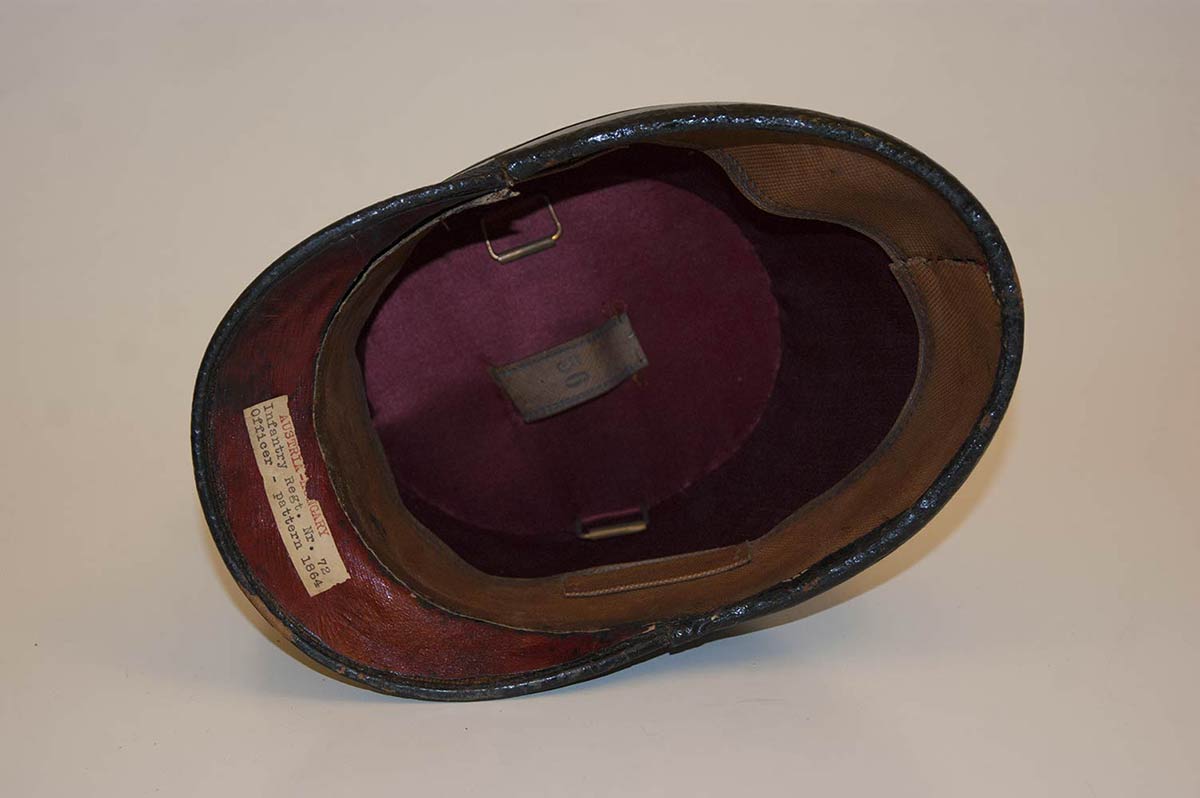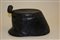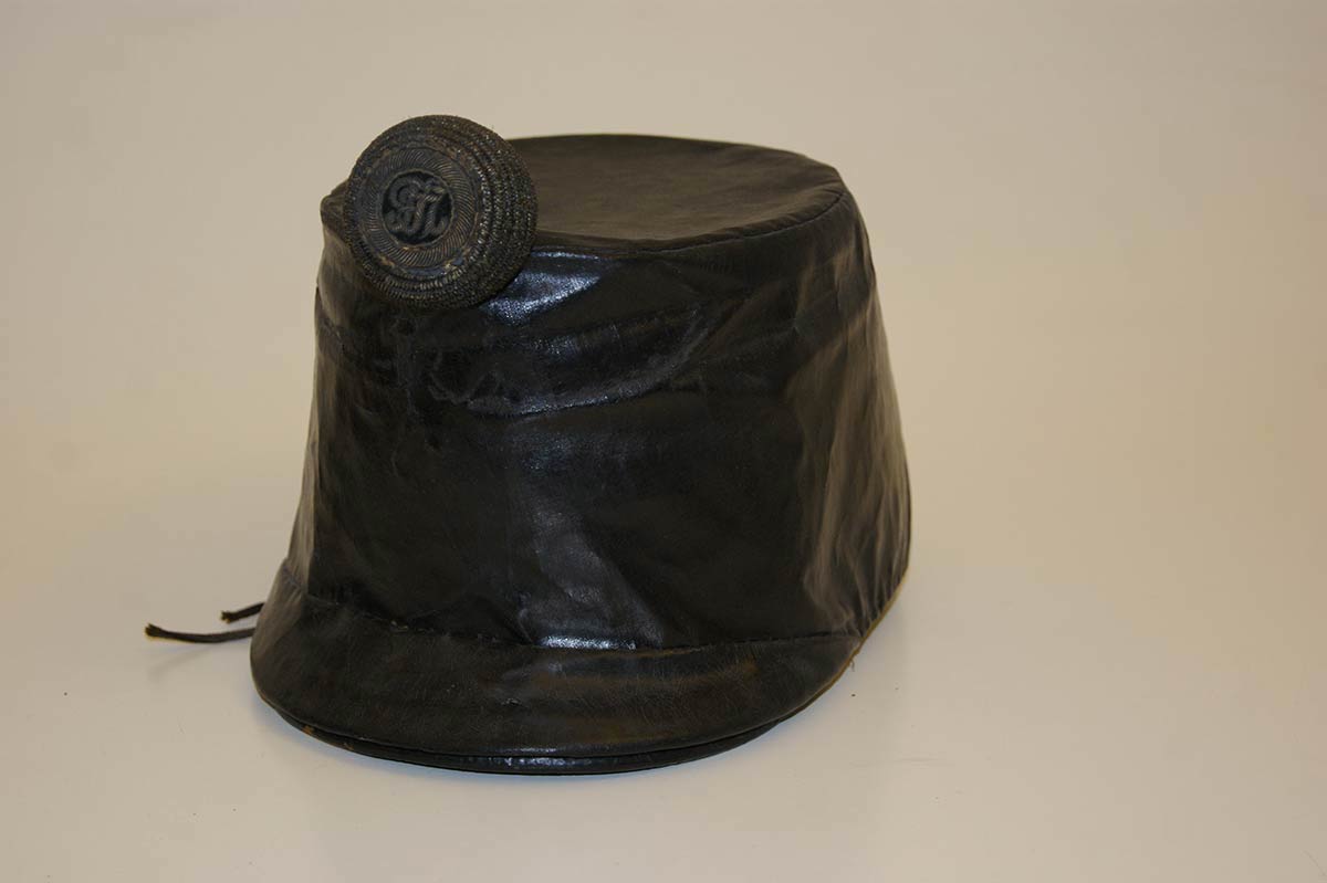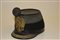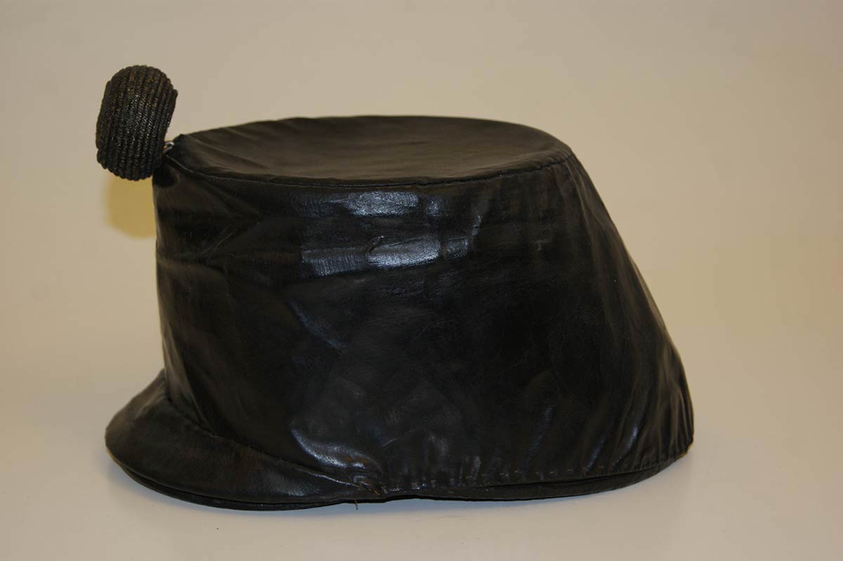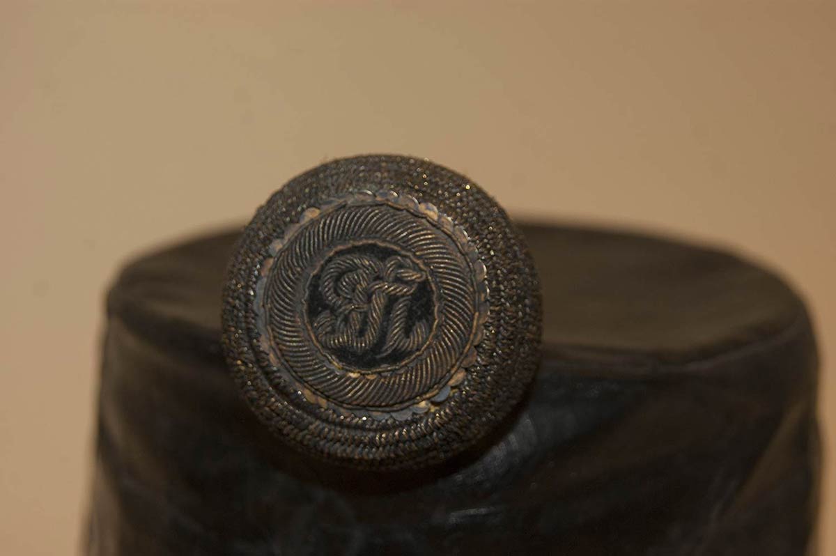 Fusto rigido ricoperto di panno nero con applicato gallone in tessuto operato oro, grande aqila bicipite in metallo dorato e nappina con le iniziali dell'imperatore, con telino antipioggia in tela cerata. Ottimo stato