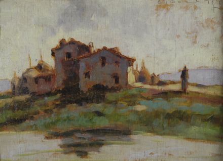 Carlo Domenici (Livorno, 1898 - 1981) Casale Olio su compensato, cm. 14,5x20,5 Firma in alto a destra.