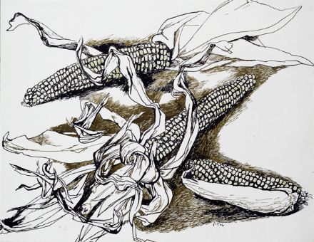 Renato Guttuso (Bagheria, 1912 - Roma, 1987) Pannocchie, 1963-64 China e acquarello su cartoncino riportato su tela, cm. 48,5x61,5 Firma in basso al centro. Sul verso: etichetta Studio Gastaldelli, Milano. Autentica dell'autore su foto. Autentica Archivi Guttuso su foto con il n. 1815411739.