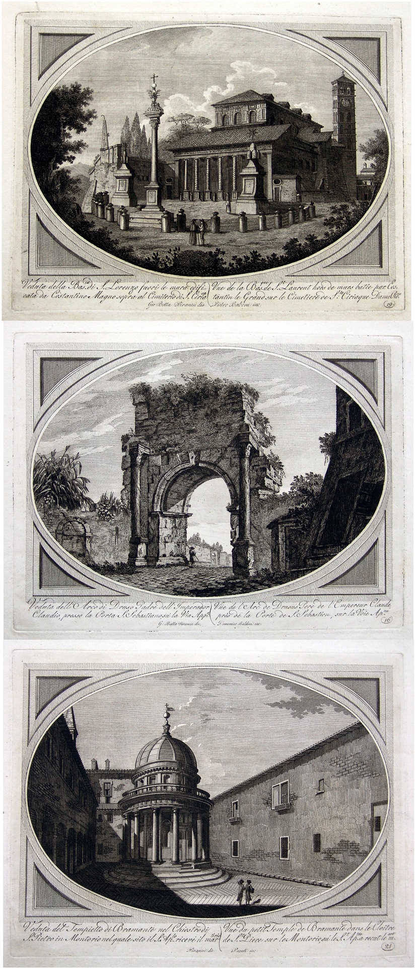 GIOVANNI BATTISTA PIRANESI, Veduta della Bas. di San Lorenzo, Veduta dell'Arco di Druso, Veduta del Tempietto di Bramante (lotto unico con tre opere)
