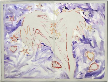 Mario Schifano (Homs, 1934 - Roma, 1998) Oasi, 1979-80 Smalto su tela, cm. 180x240 (dittico) Firma al centro. Certificato Fondazione M.S. Multistudio, n. 79-80/876 Fotografia dell'artista mentre realizza l'opera.