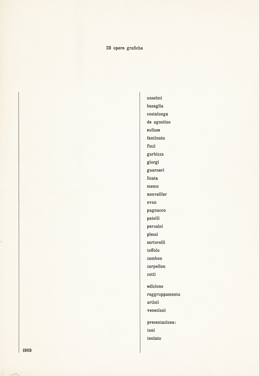 Cartella contenente testo di presentazione di Toni Toniato e 23 opere fotolitografiche dei seguenti autori: Anselmi, Basaglia, Costalonga, De Agostino, Eulisse, Fantinato, Finzi, Garbizza, Giorgi, Guarneri, Licata, Memo, Nonveiller, Ovan, Pagnacco, Patelli, Perusini, Plessi, Sartorelli, Toffolo, Zambon, Zarpellon, Zotti