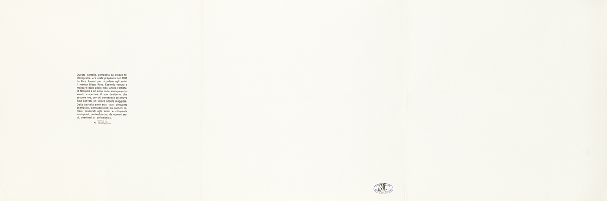Entro folder originale con timbro dell'Archivio Bice Lazzari, testo di presentazione e numerazione a matita (Esemplari XXXVII/L)