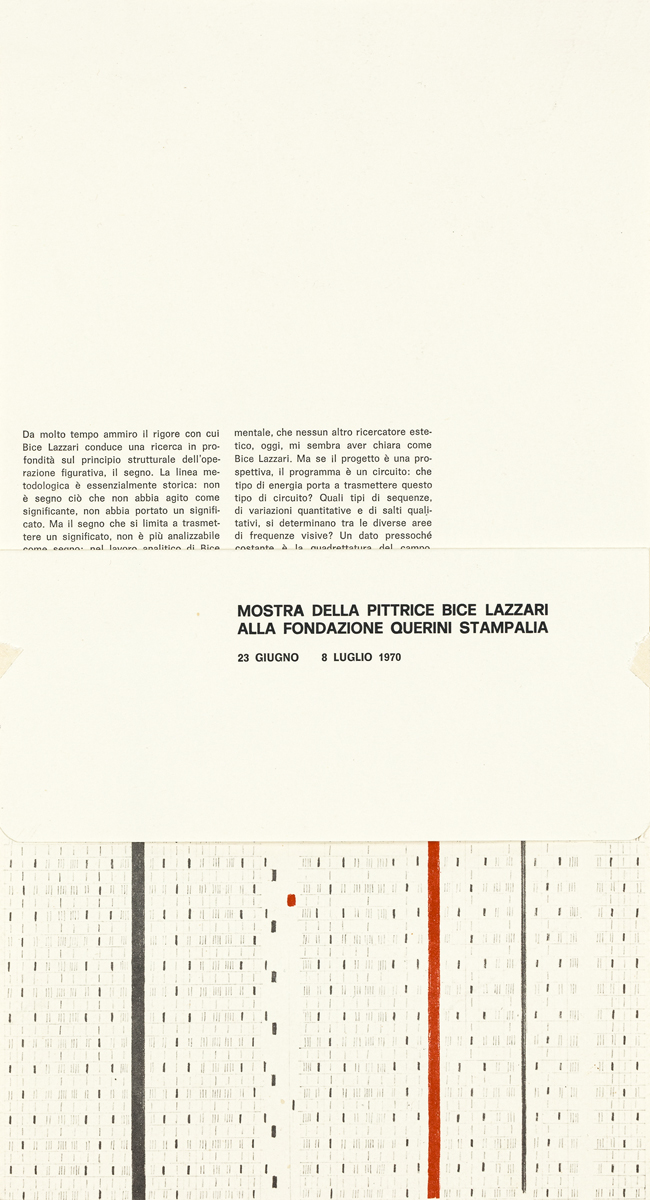 Si allega un pieghevole illustrato, con testo di G. C. Argan, edito in occasione dell'esposizione personale dell'Artista tenutasi presso Fondazione Querini Stampalia, Venezia, 1970