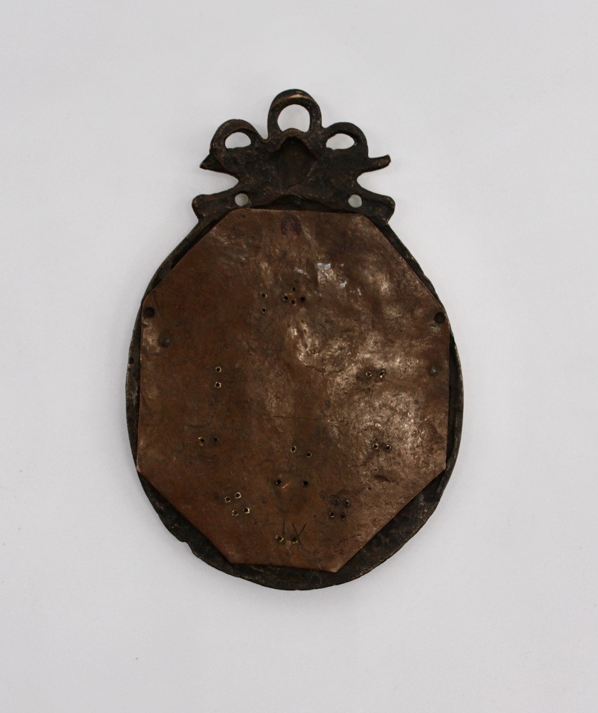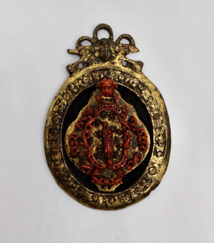 Placca in bronzo dorato con applicazioni di coralli e figura della Vergine Immacolata al centro.