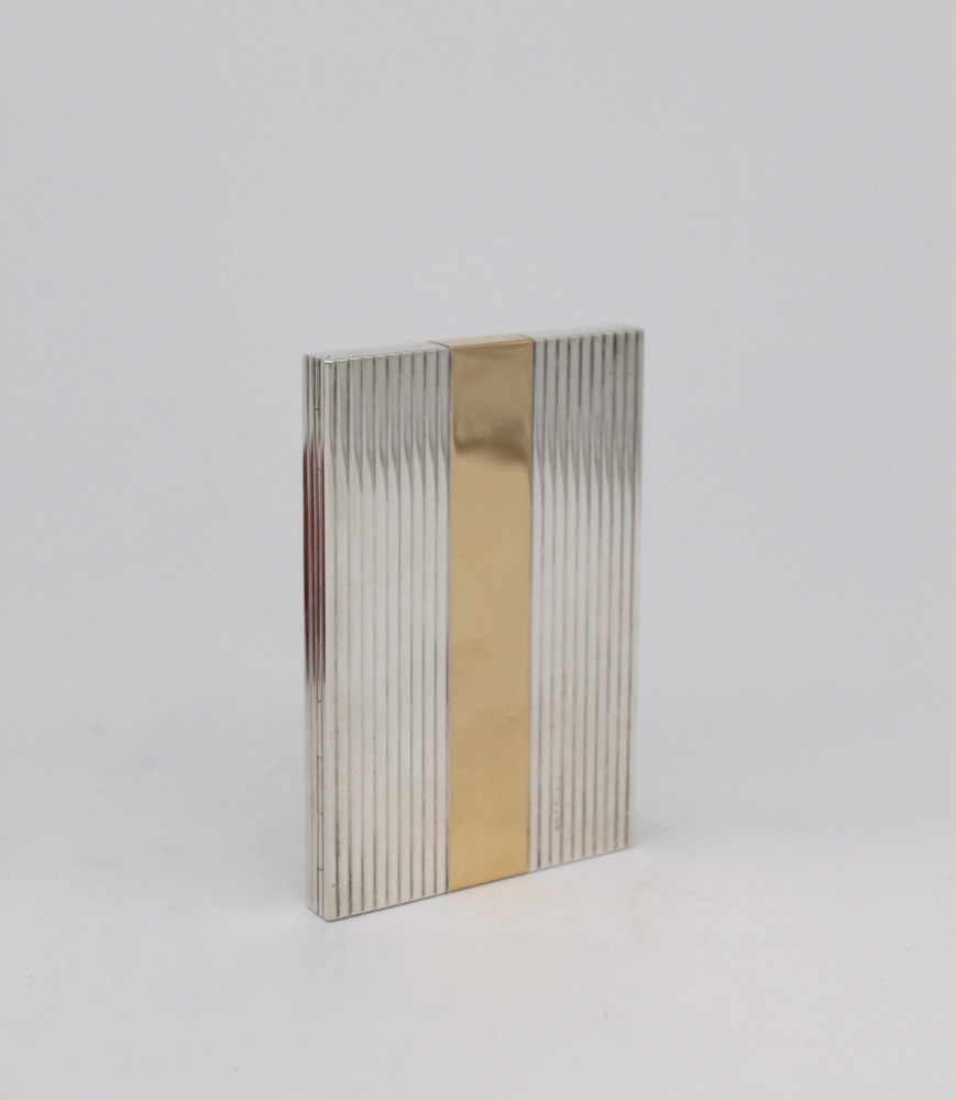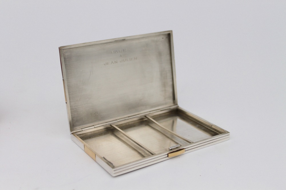 In argento filettato con fascia centrale liscia in oro, entro astuccio in cuoio originale.