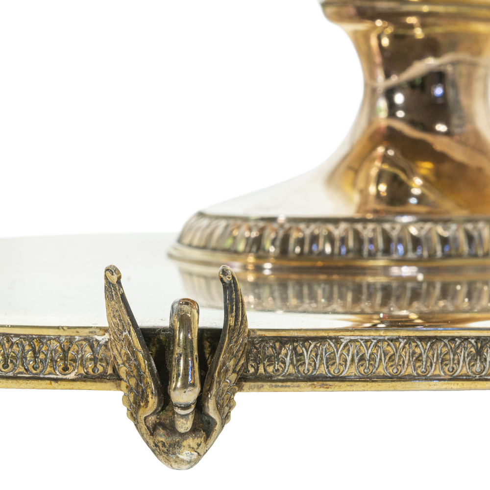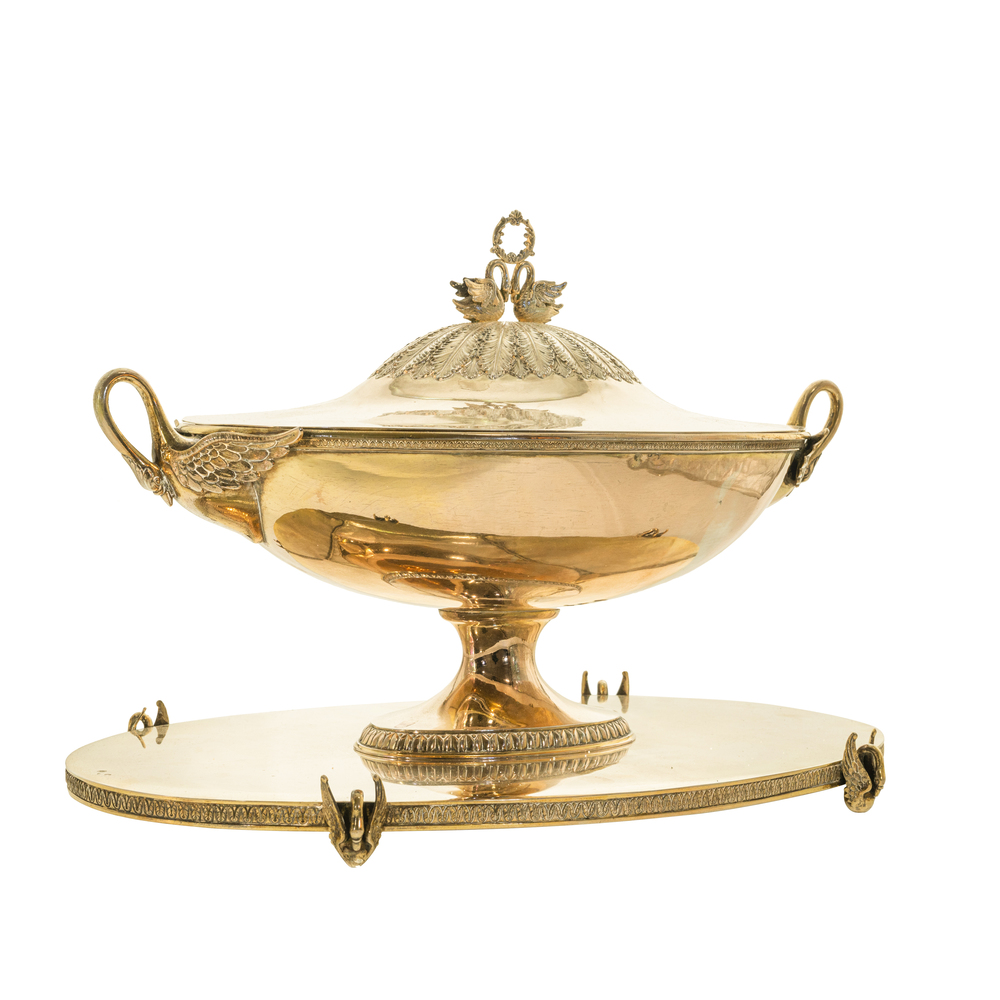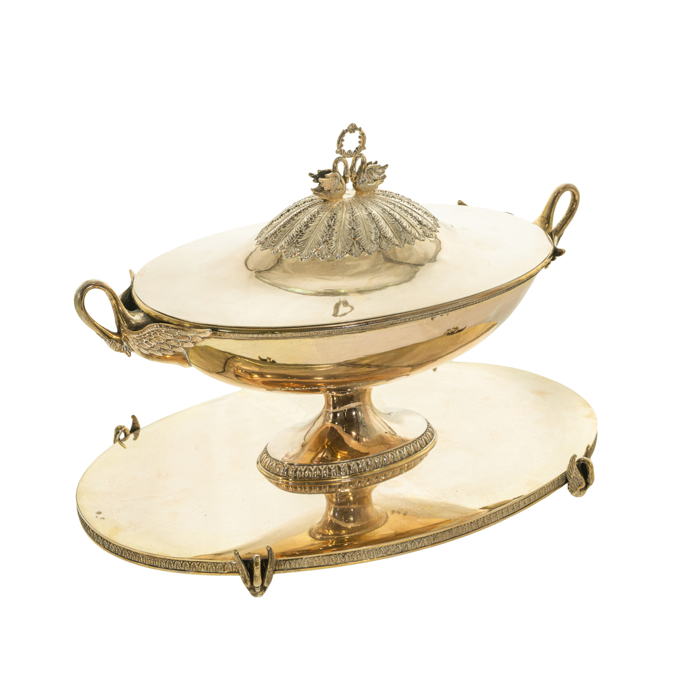 Zuppiera con vassoio in argento dorato