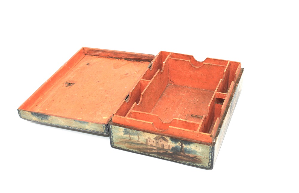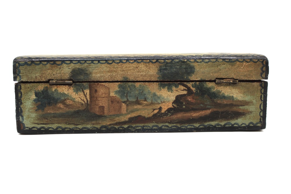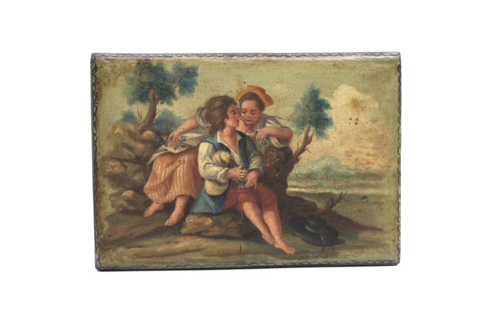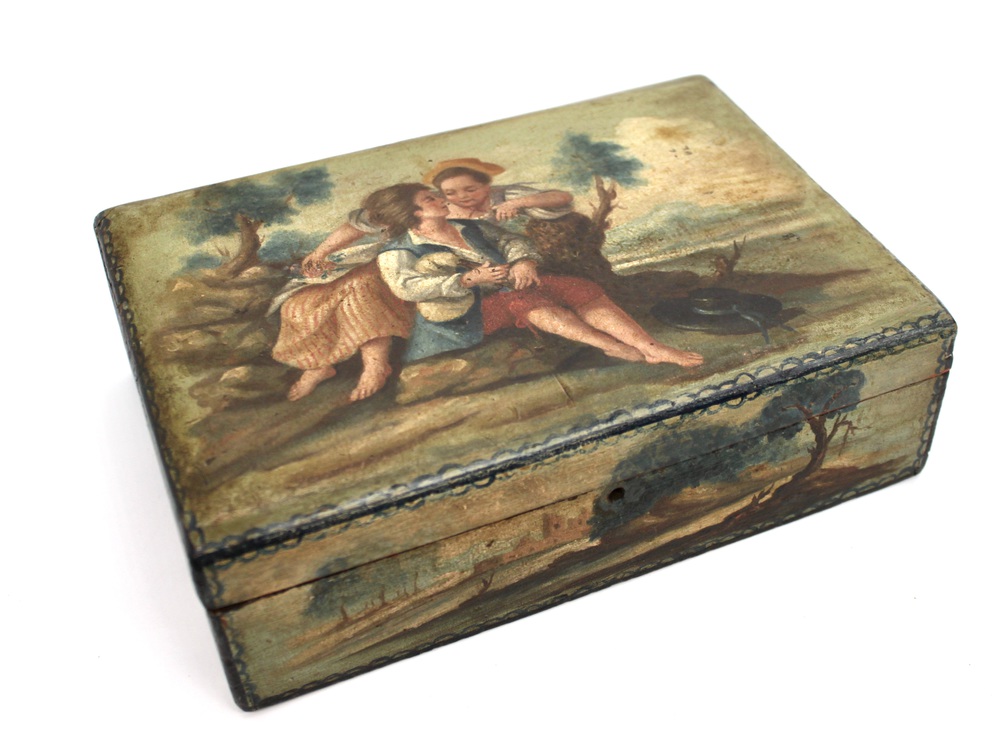 Scatola in legno rifinito a lacca dipinta con motivi arcadici e amorosi
