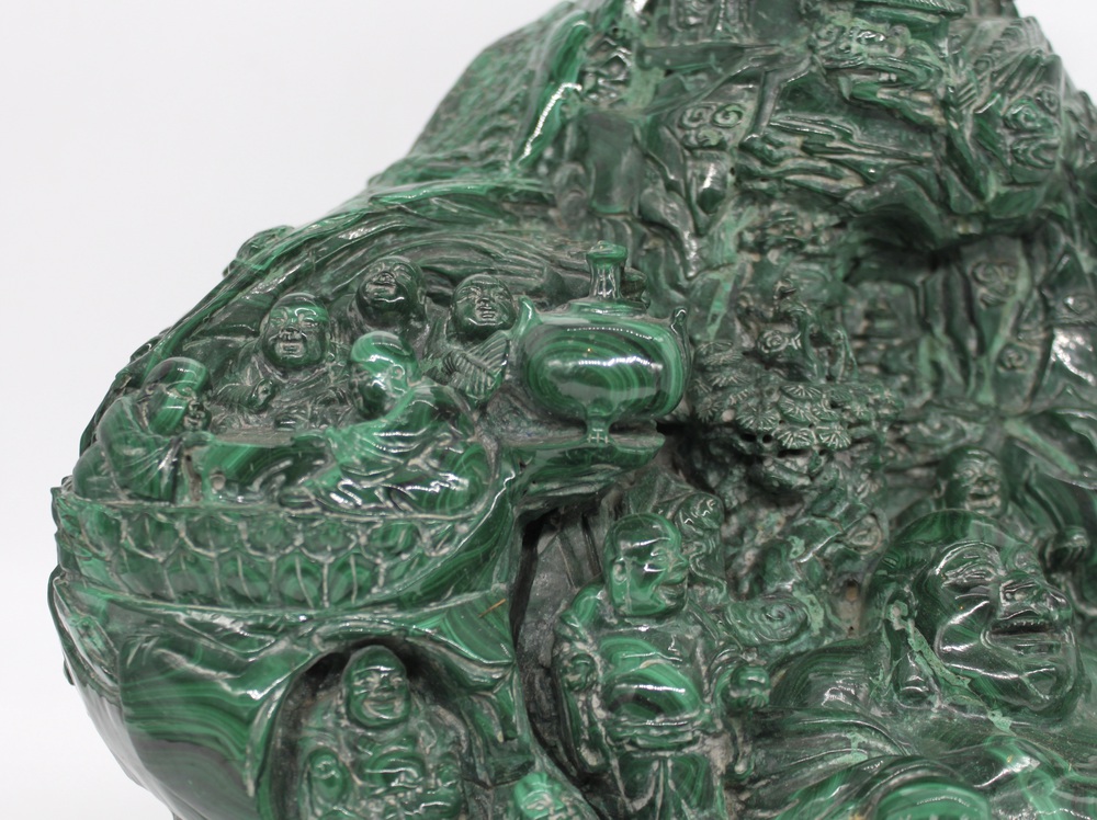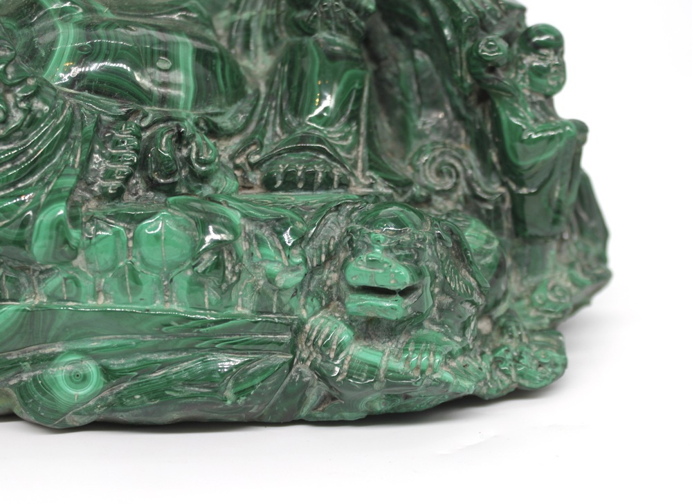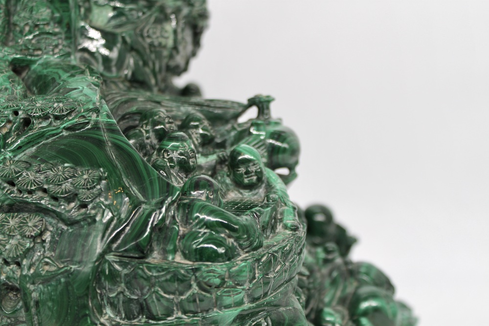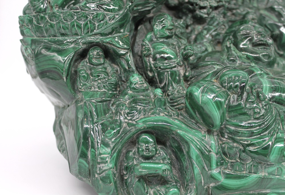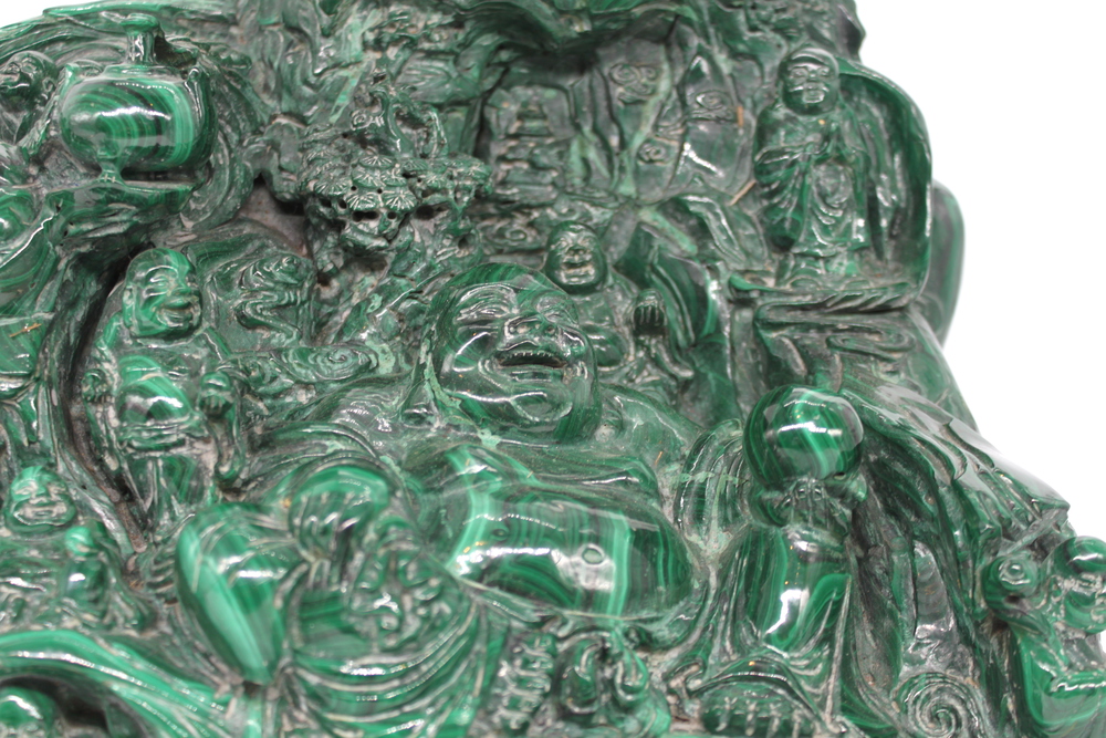 Grande gruppo in malachite con raffigurazioni di Budai ridenti