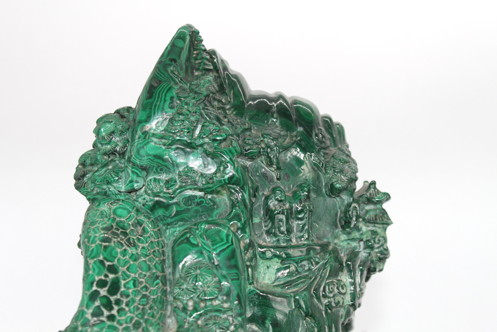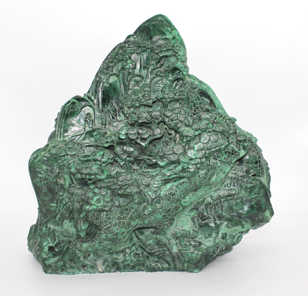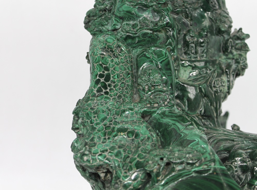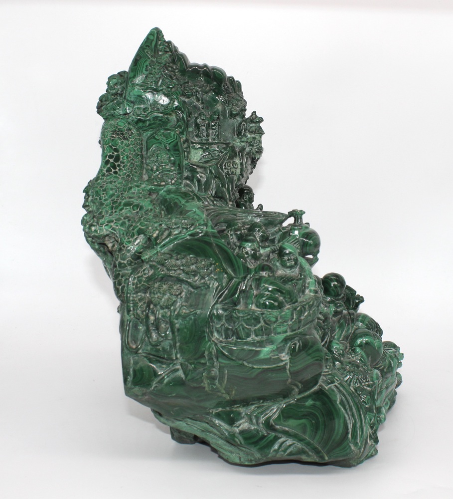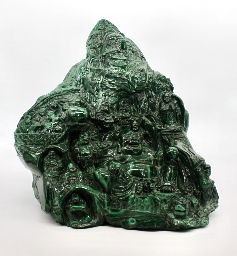 Grande gruppo in malachite con raffigurazioni di Budai ridenti