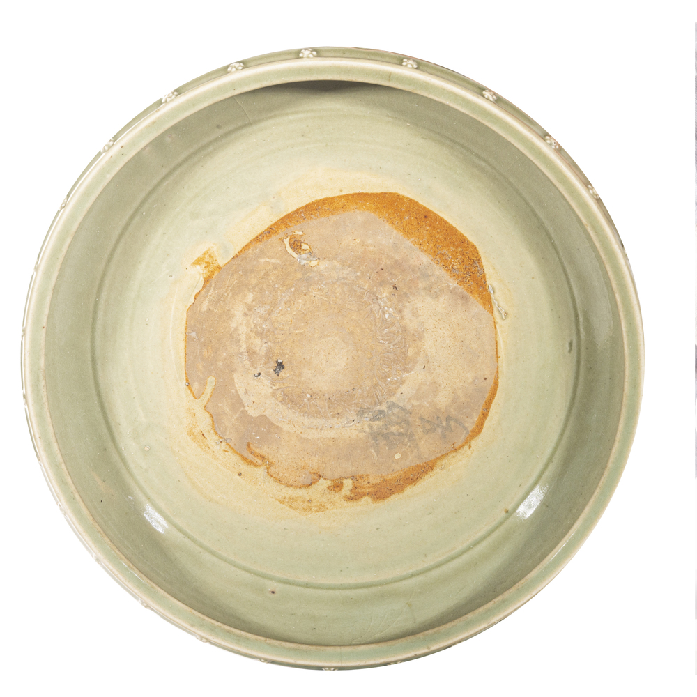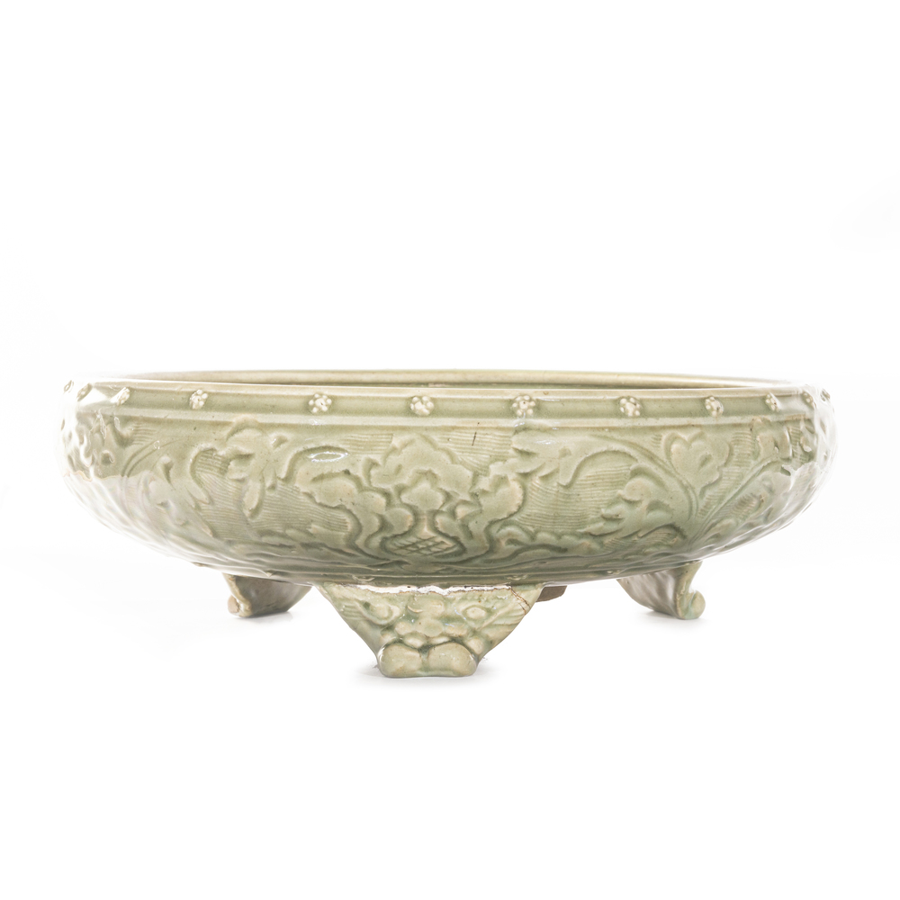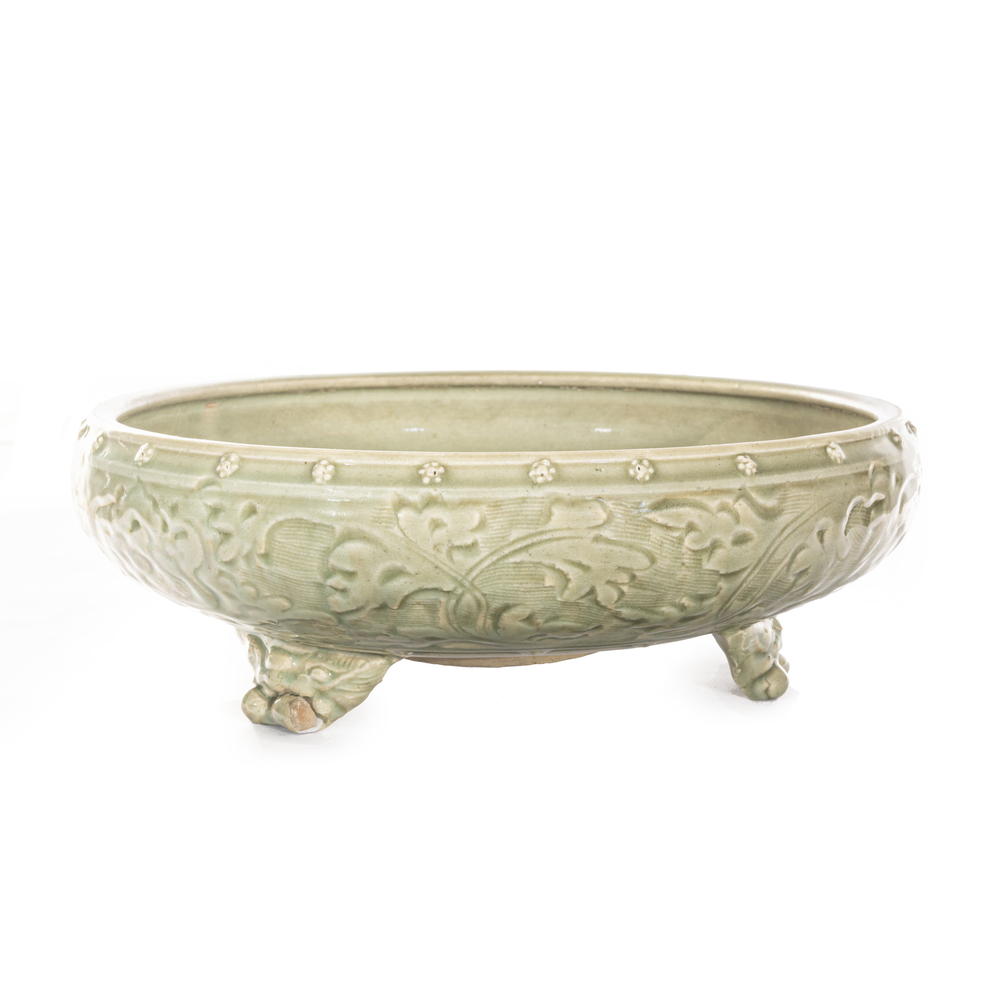 A Celadon porcelain censer with relief decorations, on three paw feet