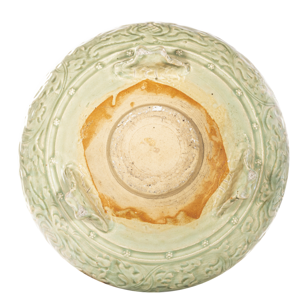 Incensiere in porcellana Celadon con decori in rilievo , su tre piedi a zampa ferina