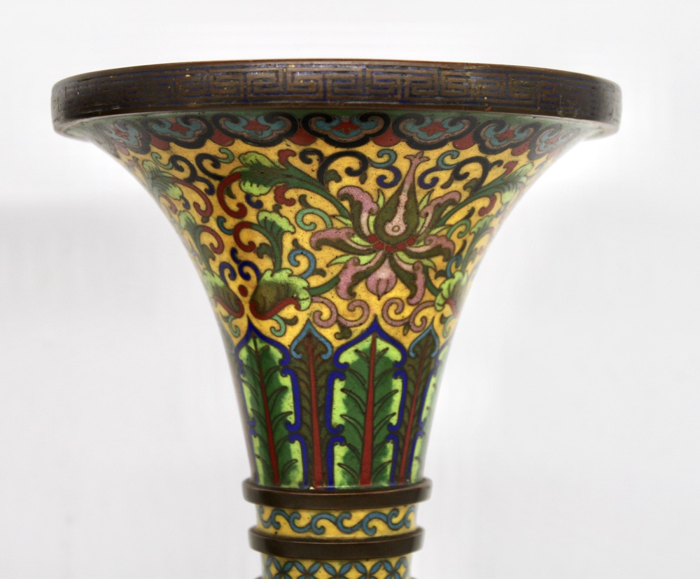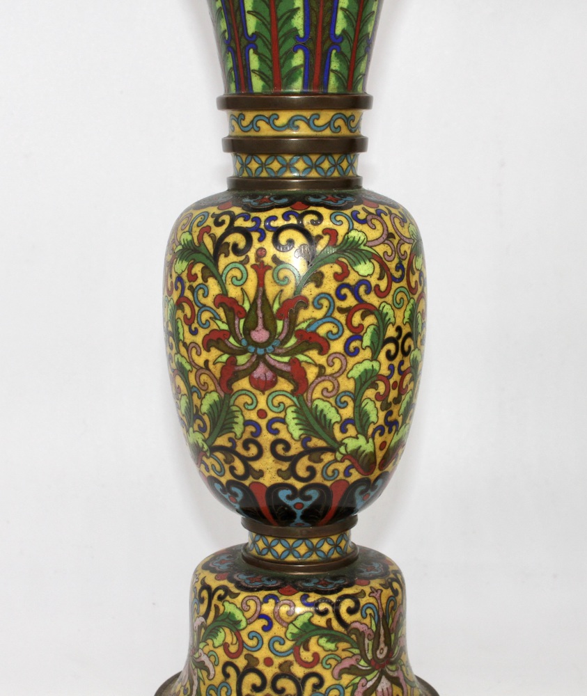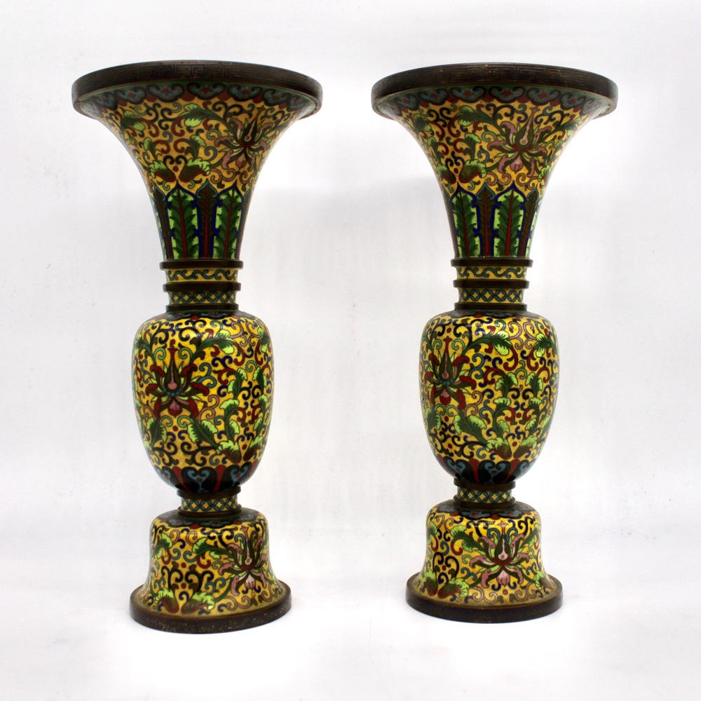 Pair of cup-shaped vases in cloisonné metal, with a yellow background and floral decoration