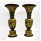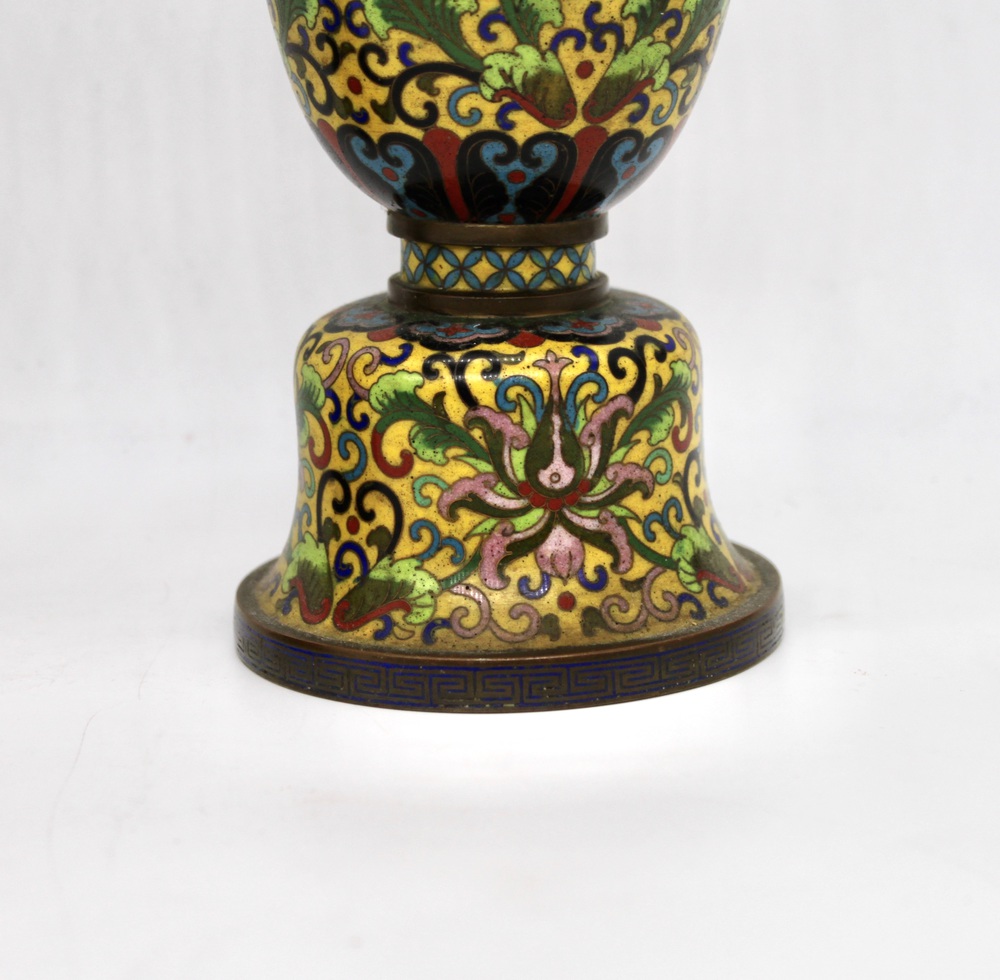 Coppia di vasi a coppa in metallo cloisonnè , a fondo giallo con decoro flreale
