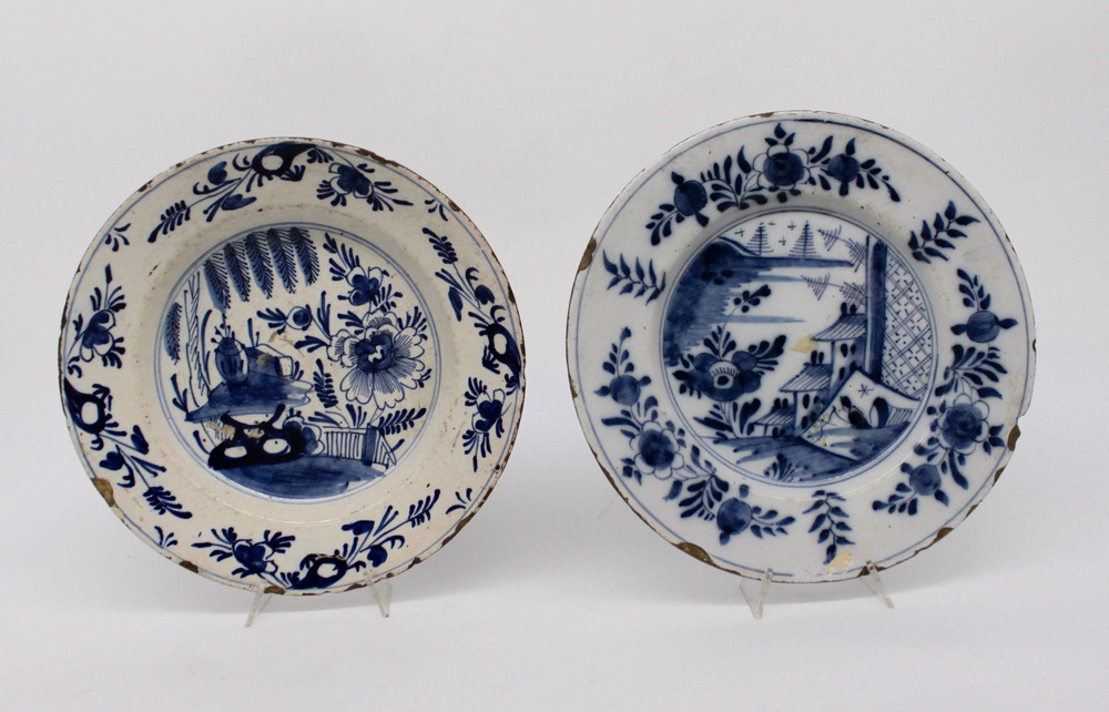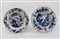 Coppia di piatti in porcellana bianca e blu decorati con paesaggi