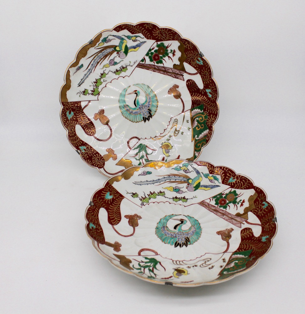 Coppia di piatti in porcellana policroma decorati con volatili