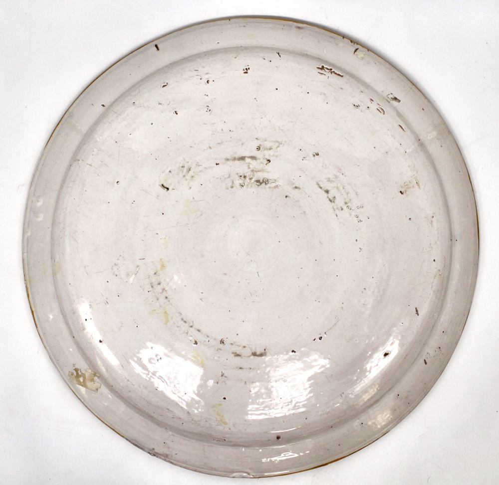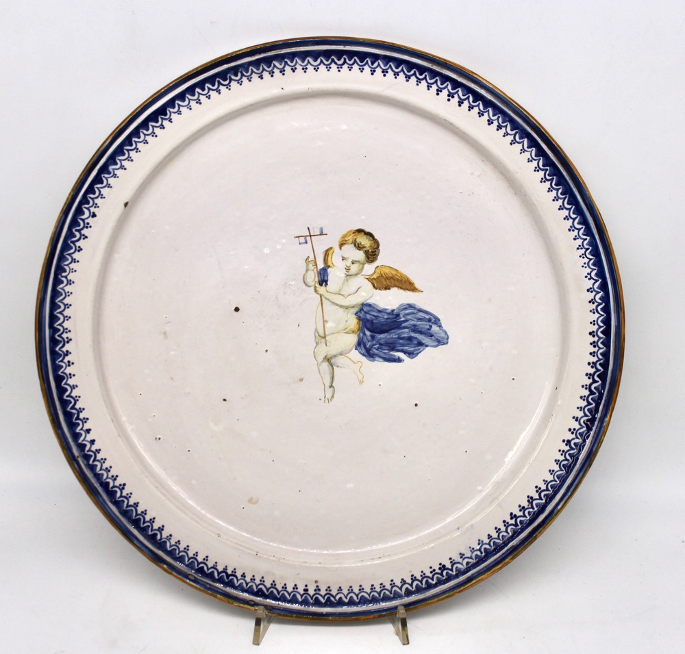 Piatto da portata in maiolica decorato con putto alato che regge la croce