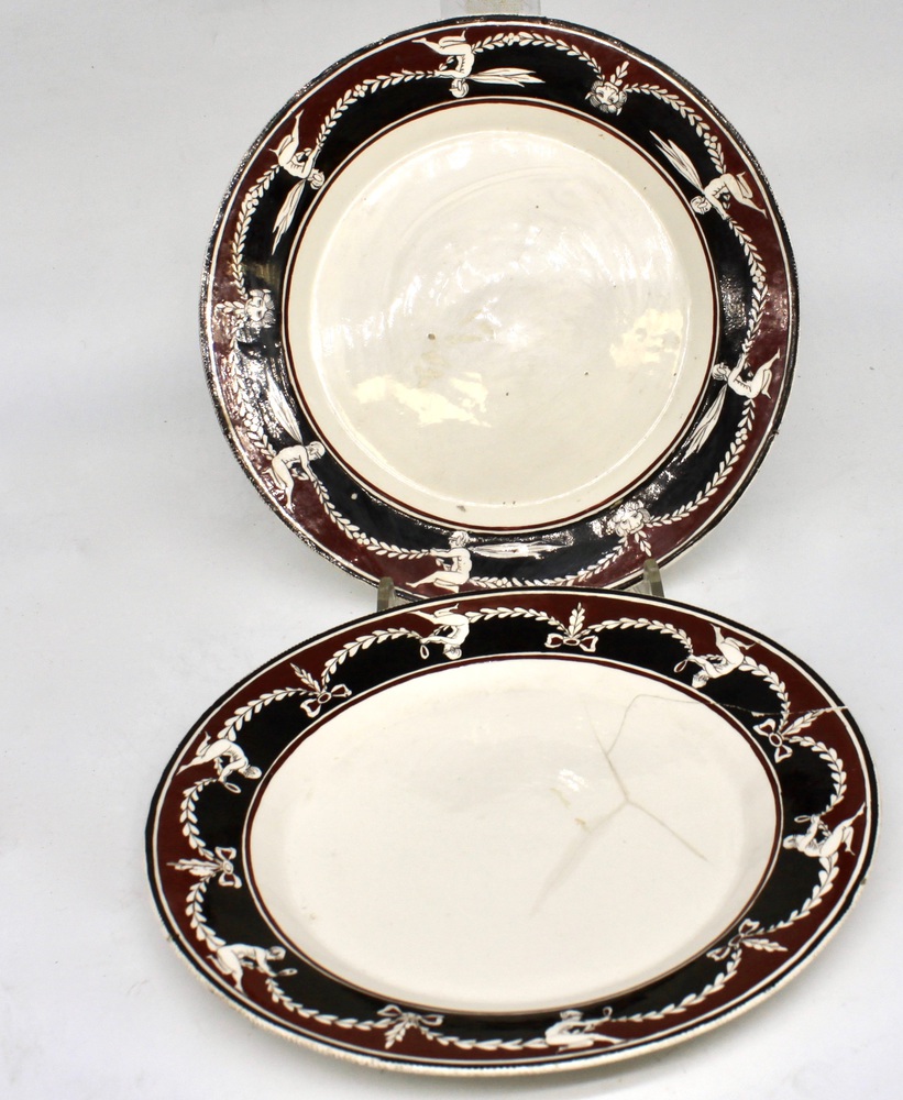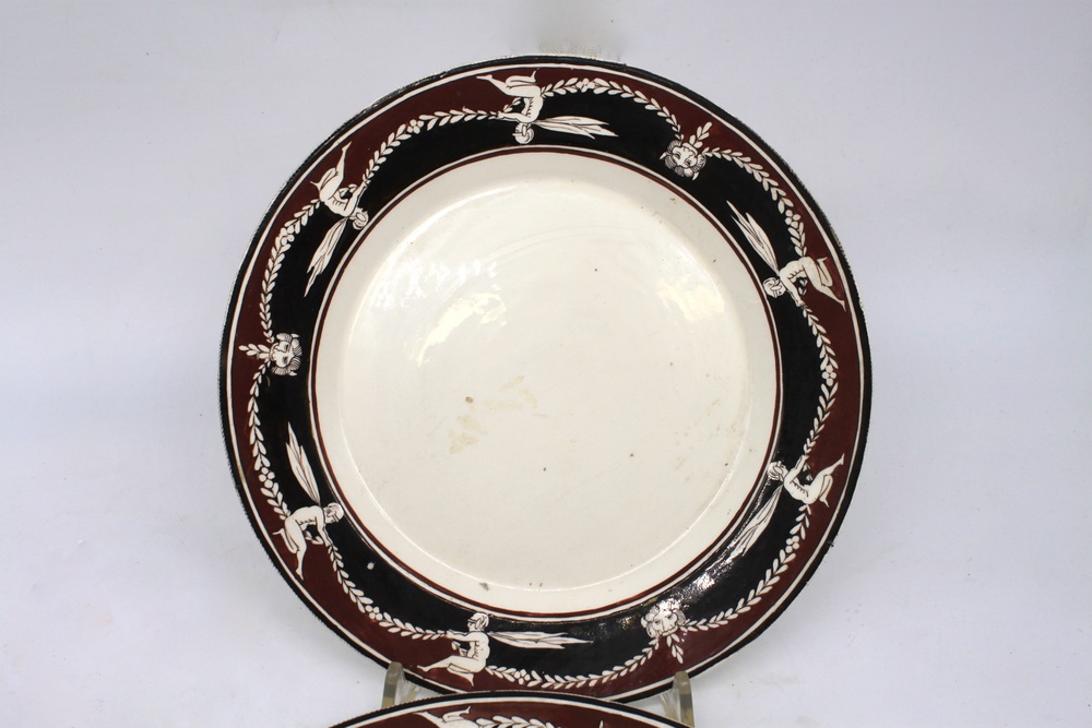 A pair of plates with polychrome rim decorated with figures and ears of wheat