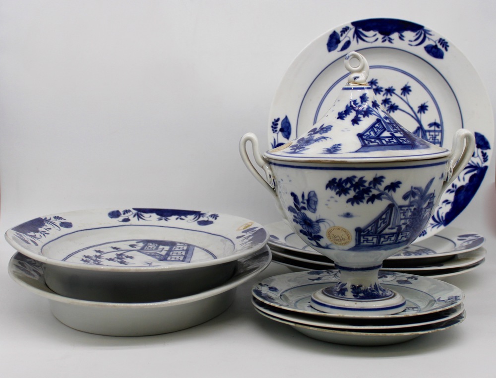 Consisting of a soup bowl, four round serving plates, two oval trays and three soup plates