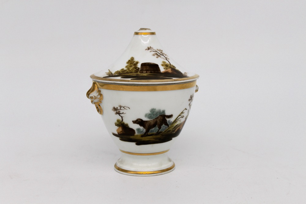 A porcelain sugar bowl with gold profiles and polychrome decoration with pastoral scene