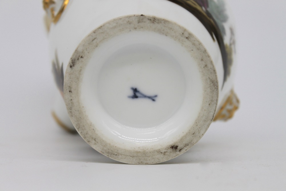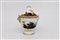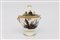 Zuccheriera in porcellana con profili in oro e decoro policromo con scena pastorale