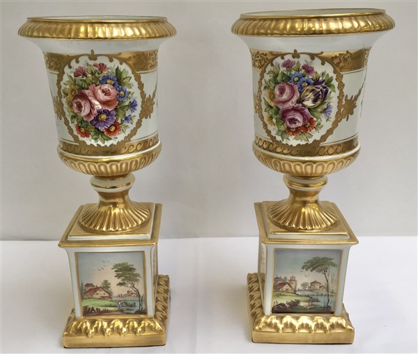 Coppia di vasi in porcellana decorata a dorature ed in policromia a fiori e paesaggi (h. cm 47,5) (lievi difetti)