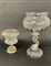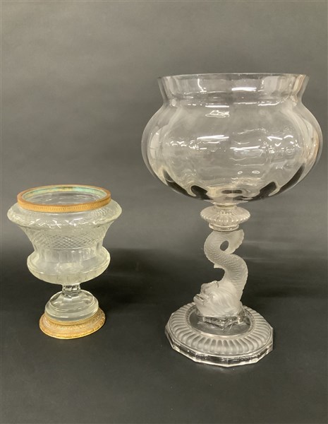 Lotto composto da una coppa in vetro con fusto decorato da delfino a tutto tondo ed una in cristallo con montatura in metallo dorato (h max cm 42) (difetti)
