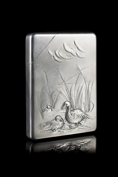 Fiaschetta in argento 925 sbalzato a papere in uno stagno. Argentieri Fratelli Cacchione (10,5x1,4x7,5) (g 174) (difetti)