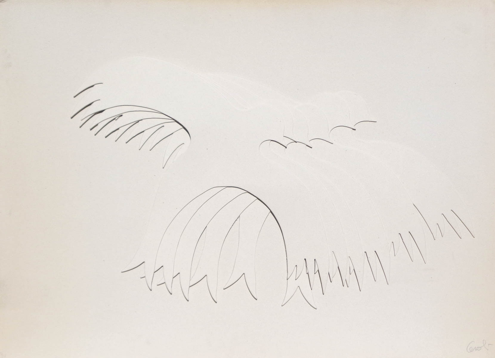 Mario Ceroli (Castel Frentano 1938) Gabbiani, 1988;Legno e carta, 101 x 73 cm, Edizione Studio di Val Cervo