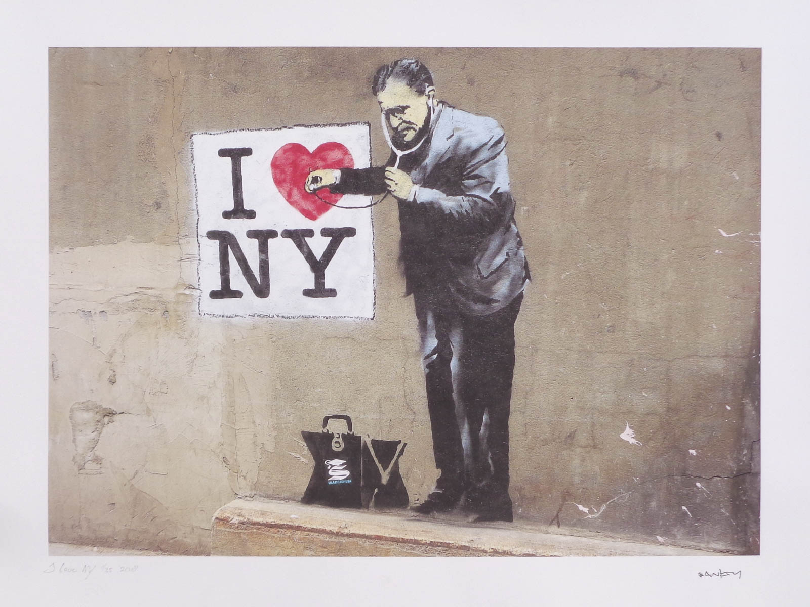 Banksy I love NY, 2018;Litografia a col. su cartone, 84,5 x 65,5 cm, timbro