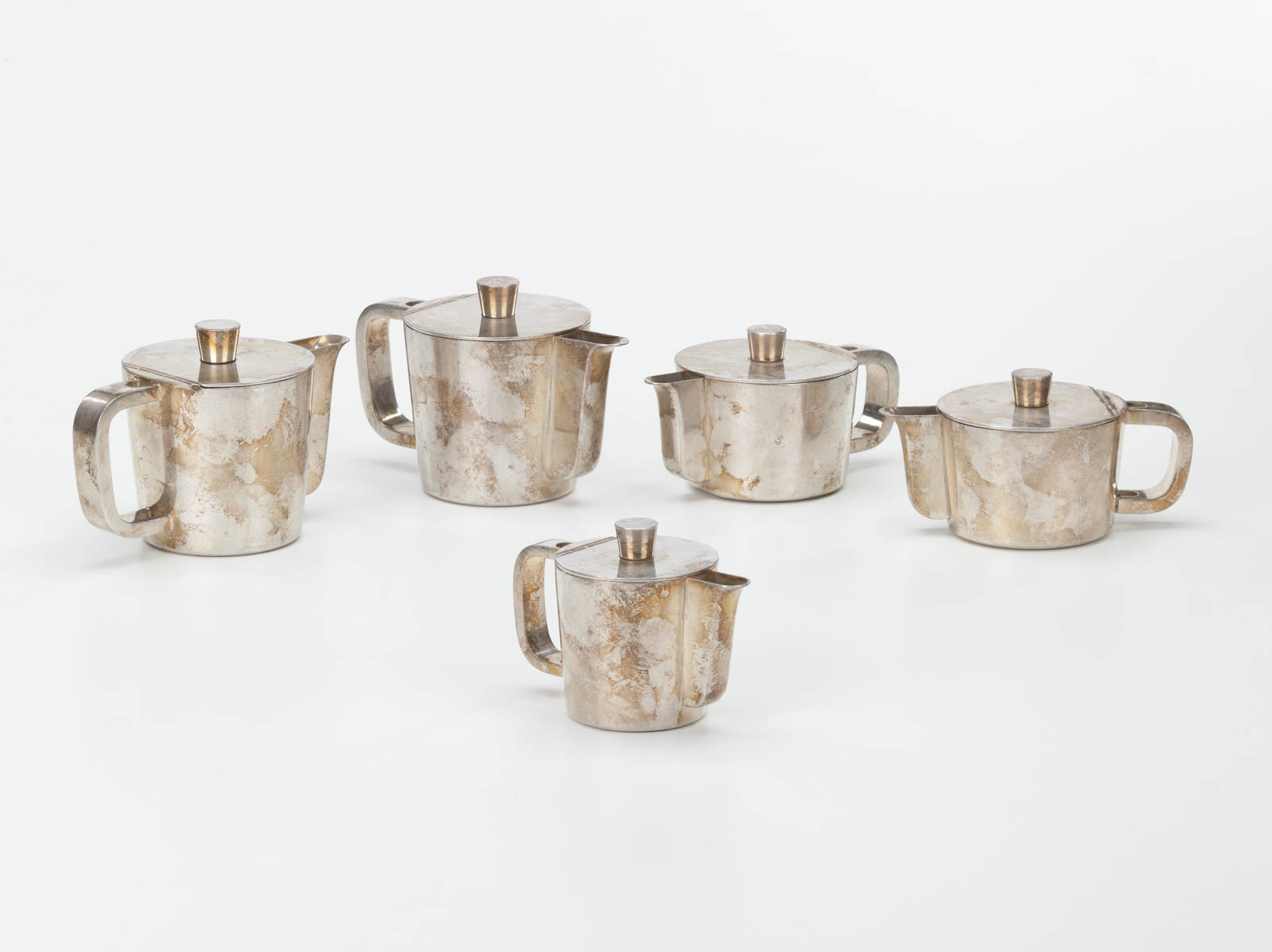 Gio Ponti (1891 – 1979) Set di 5 lattiere, 1936;In alpacca, 18 x 11 x 10 cm, produzione