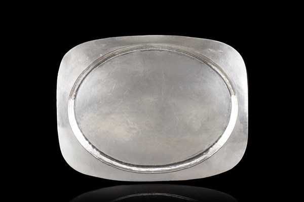 Vassoio in argento martellato di forma sagomata. Titolo 800. Firenze. Brandimarte, 1973 (cm 46,7x36) (g 1400)