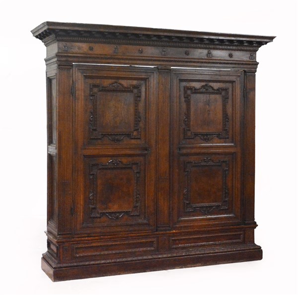 Armadio in noce a due ante riquadrate da sagome intagliate ad unghiature e volute, montanti a mezza colonna scanalata, cappello aggettante, secolo XVII (cm 214x208x53) (difetti e restauri)