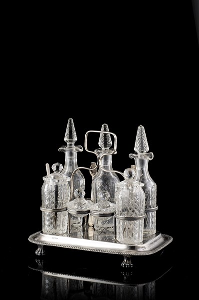 Cruet in metallo argentato, con sette ampolle in vetro e quattro cucchiaini in argento del secolo XIX (cm 23x21,5x15,3)
