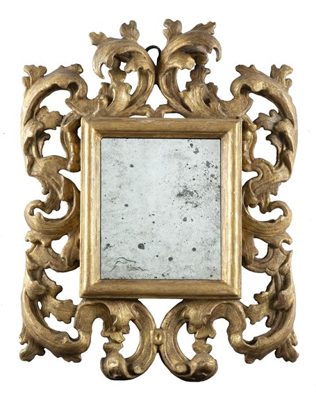 Specchiera in legno dorato e intagliato a volute. Secolo XVIII (cm 60x45) (dife
