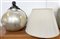 Lotto di due lampade da tavolo in vetro e metallo inciso, forme, decoro e misure diverse con paralumi (h max cm 43) (difetti)