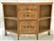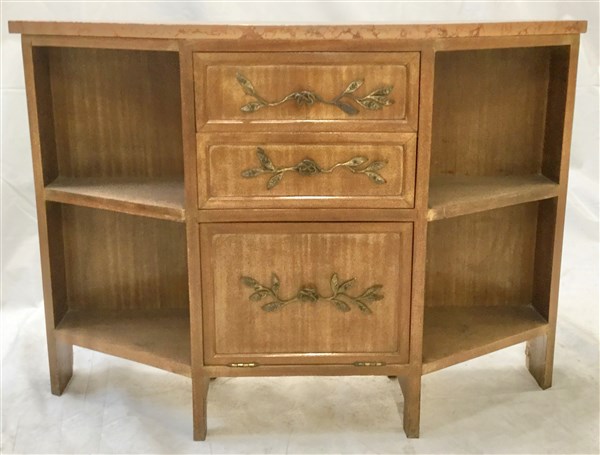 Credenzino scantonato a due cassetti ed anta con prese in metallo decorato a ra