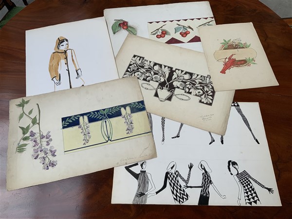 Cartella contenente sei disegni scolastici di ornato e figurino di moda (difett