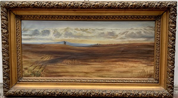 Ignoto "Paesaggio" olio su tela (cm 35x80) siglato Re in basso a destra. In cornice